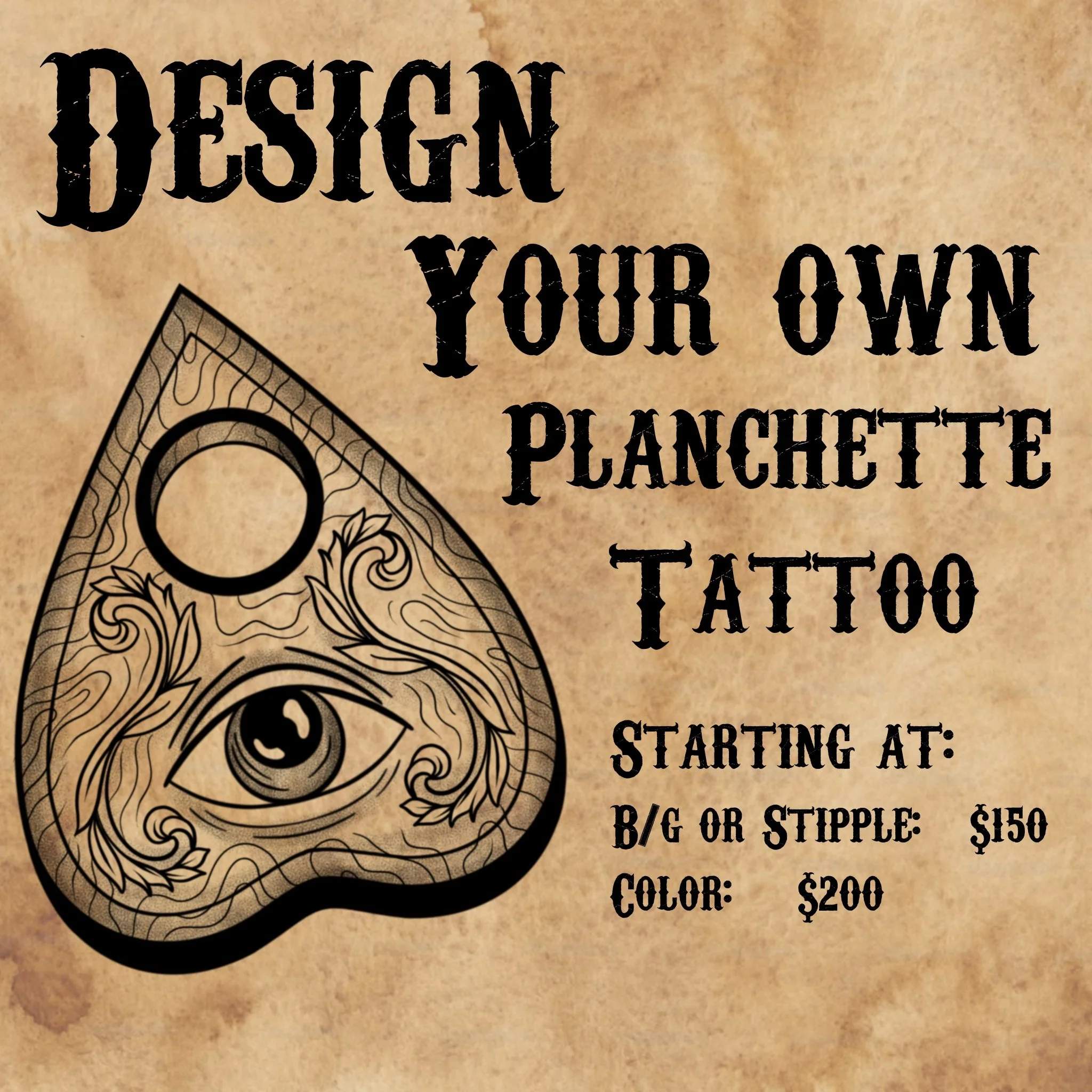 Create a custom Planchette tattoo by selecting from the available design options below. To schedule an appointment, please click the provided links, send a text to 407-310-6586, or email ashbutterstattoos@gmail.com.